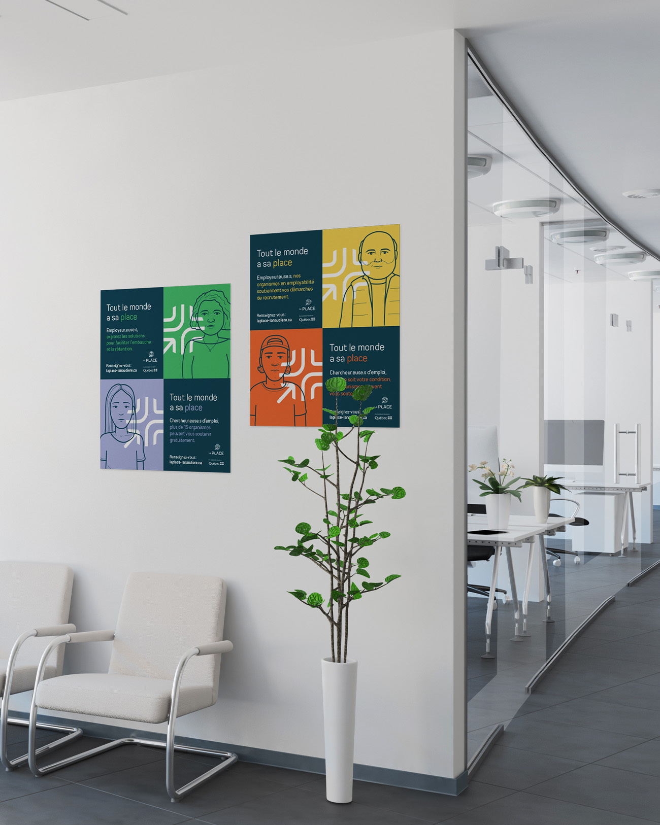 To bring this message to life, the agency first took the time to examine the different realities of the region's job seekers and employers. This led to the creation of several personas, each embodied by a custom illustration and a distinct color. This approach humanizes the message and reflects the diversity of backgrounds and needs.